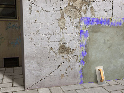 Réparation d'un revêtement en mortier avec des fissures généralisées et des défauts superficiels, avec du mortier acrylique et une maille
