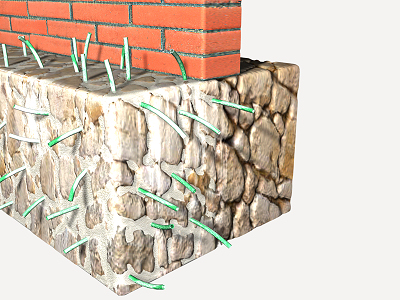 GAO080 Coulis de ciment injecté sous pression, dans la fondation en maçonnerie à sec, avec des graviers ou des gravats, pour la reprise en sous-oeuvre de la fondation